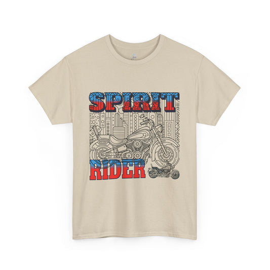 Spirit Rider T-Shirt featuring a motorcycle riding through a city environment during both day and night. This tee exudes a sense of adventure and exploration, perfect for motorcycle enthusiasts and urban travelers. Ideal for casual wear or as a statement piece during motorcycle events and gatherings.